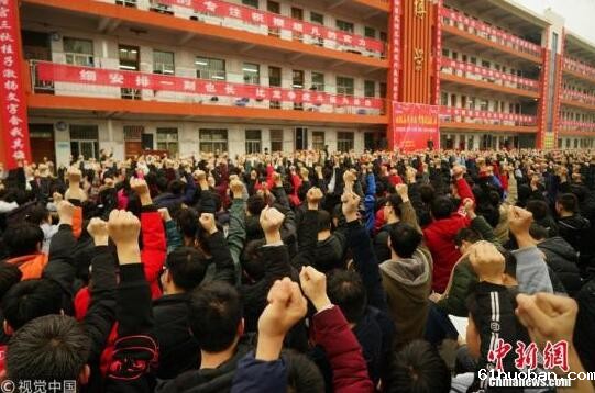 资料图:一所中学举行高考百日誓师大会。