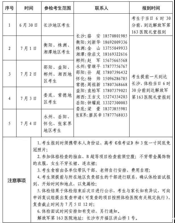 体格检查各项结果(辅助性检查除外)和面试结论均当场告知考生本人,对当场不能作出结论的血常规、尿液、血清艾滋病毒抗体等体格检查项目,考生可在体格检查2日后向163医院查询。163医院设体检结果公示区,及时公布考生体检结果。考生也可通过“湖南省军校招生”微信公众号查询体检面试结果。